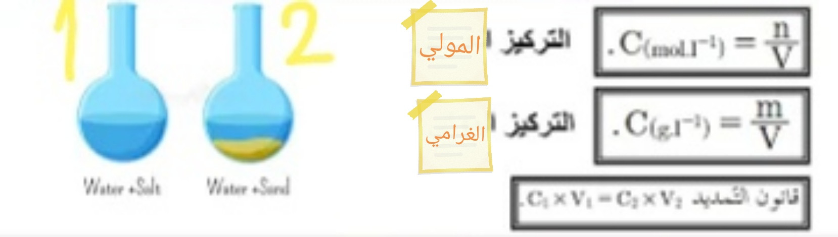عزيزي المتعلم بعد أن تعرفت على مفهوم المحلول لنتعرف كيفية تمديد المحلول واستنتج مفهوم التركيز من خلال الصورة الآتية حيث وضعنا في الحوجلة رقم 1 (50g)من الملح في ليتر من الماء المقطر وفي الحوجلة رقم 2(100g)من الملح في لتر من الماء المقطر وسجل نتيجتك في المنتدى