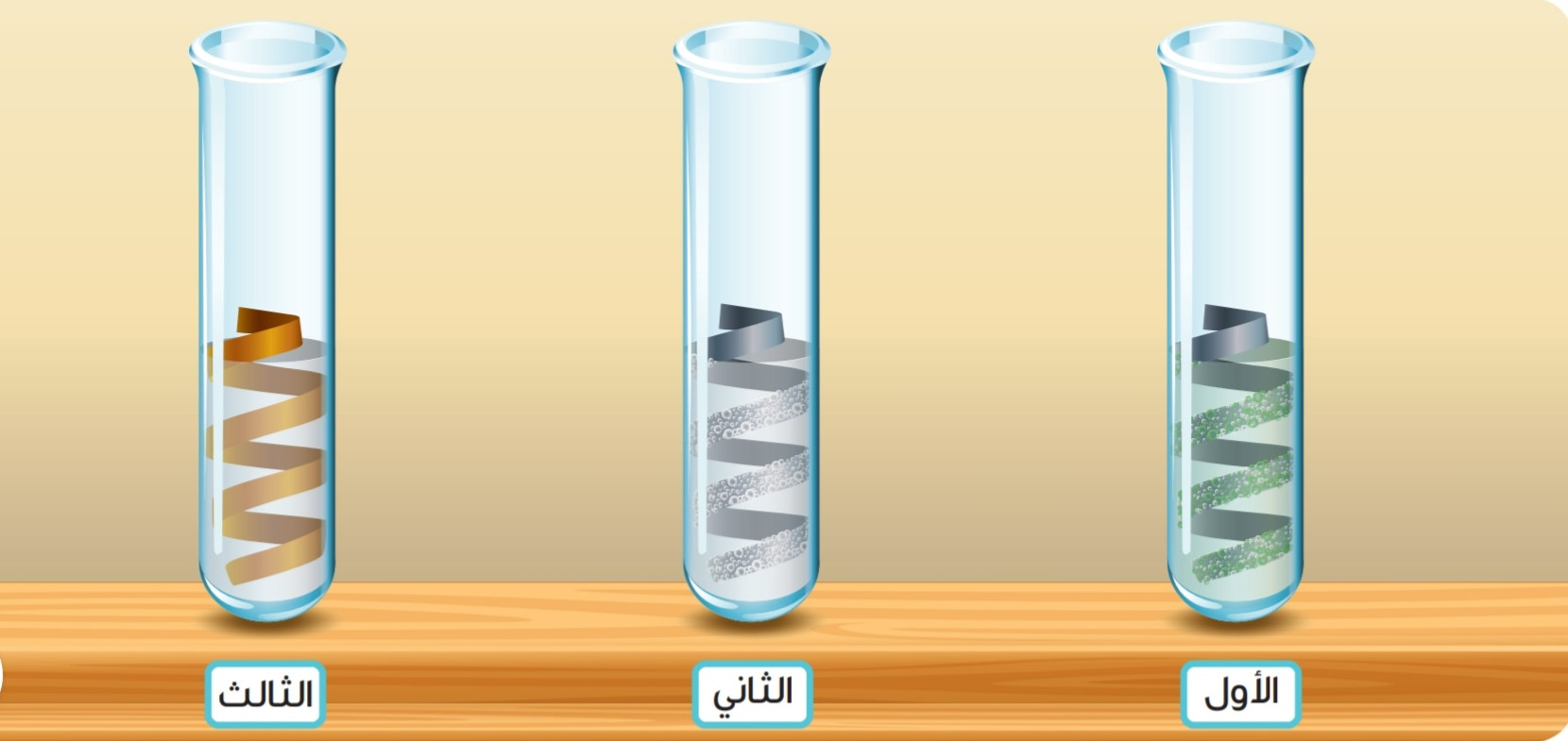 | السؤال: الصورة الآتية توضح ثلاثة أنابيب اختبار تحوي كميات متساوية من حمض الكبريت الممدد